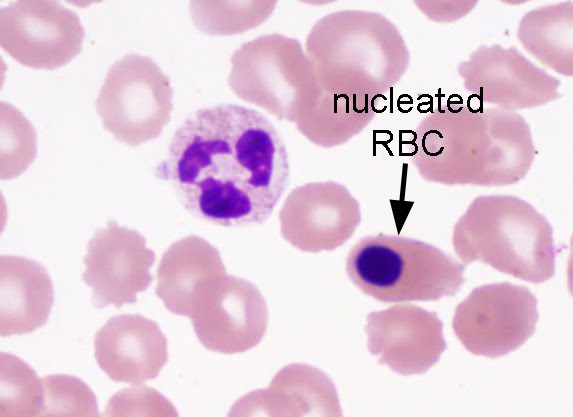 Great job everyone! Several respondents rightly raise the question of asplenia, given the Howell-Jolly bodies (nuclear remnants), nucleated RBCs, and RBC polymorphism with echinocytes (wrinkled RBCs with multiple spicules radiating from its circumference, resembling a sea urchin). These are common findings in a patient that does not have a functional spleen, since the spleen is responsible for removing RBCs that have not fully extruded their nucleus prior to entering the peripheral blood. We found out that this patient does NOT have a spleen which would explain the findings on this film.