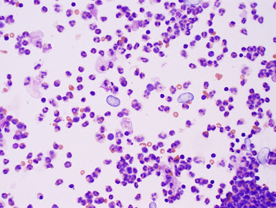 I was happy to see that the consensus supported my initial diagnosis. The features that I feel support the identification of ameba include the small size (< 10 microns in diameter), small nucleus (smaller than would be expected for an epithelial cell or macrophage) with large nucleolus/karyosome, and what appears to be phagocytosed material in the cytoplasm: