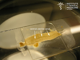 What I found to be very interesting about this case was the history of hives, suggesting an allergic reaction to the larva. The time frame of symptoms was also interesting - the patient experienced hives for ~ 1 month before expelling the worm, which indicates that either the larva was present all of that time without causing any gastrointestinal symptoms, or the patient had ongoing exposure to anisakids through his diet. I'd be curious to know - have any of my readers run into a similar case? This is actually the second case I've seen where the patient had been symptomatic for several weeks after presumed exposure and before expelling the larva. This leads me to think that some larva can exist in the host for weeks without burrowing into the gut lining. Please let me know what your experience has been!