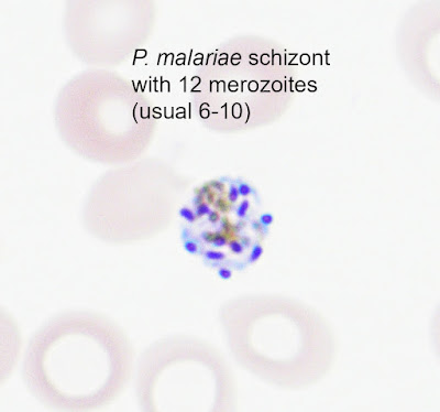 Answer to Parasite Case of the Week 677: Plasmodium malariae with classic band and schizont forms. There is also a hint of a basket form, and a nice collection of merozoites that recently burst out of an infected red blood cell. Note that the infected cells are smaller than the uninfected neighboring cells, which is classic for this species. Thank you for all of the great comments!