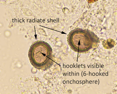 We don't actually use the India ink injection method in my lab, since it's rather finicky and it exposes my techs to the Taenia eggs. The eggs of T. solium are infectious to humans, so I prefer to pursue other routes to identification when possible. That leads me to the last thing that we try: