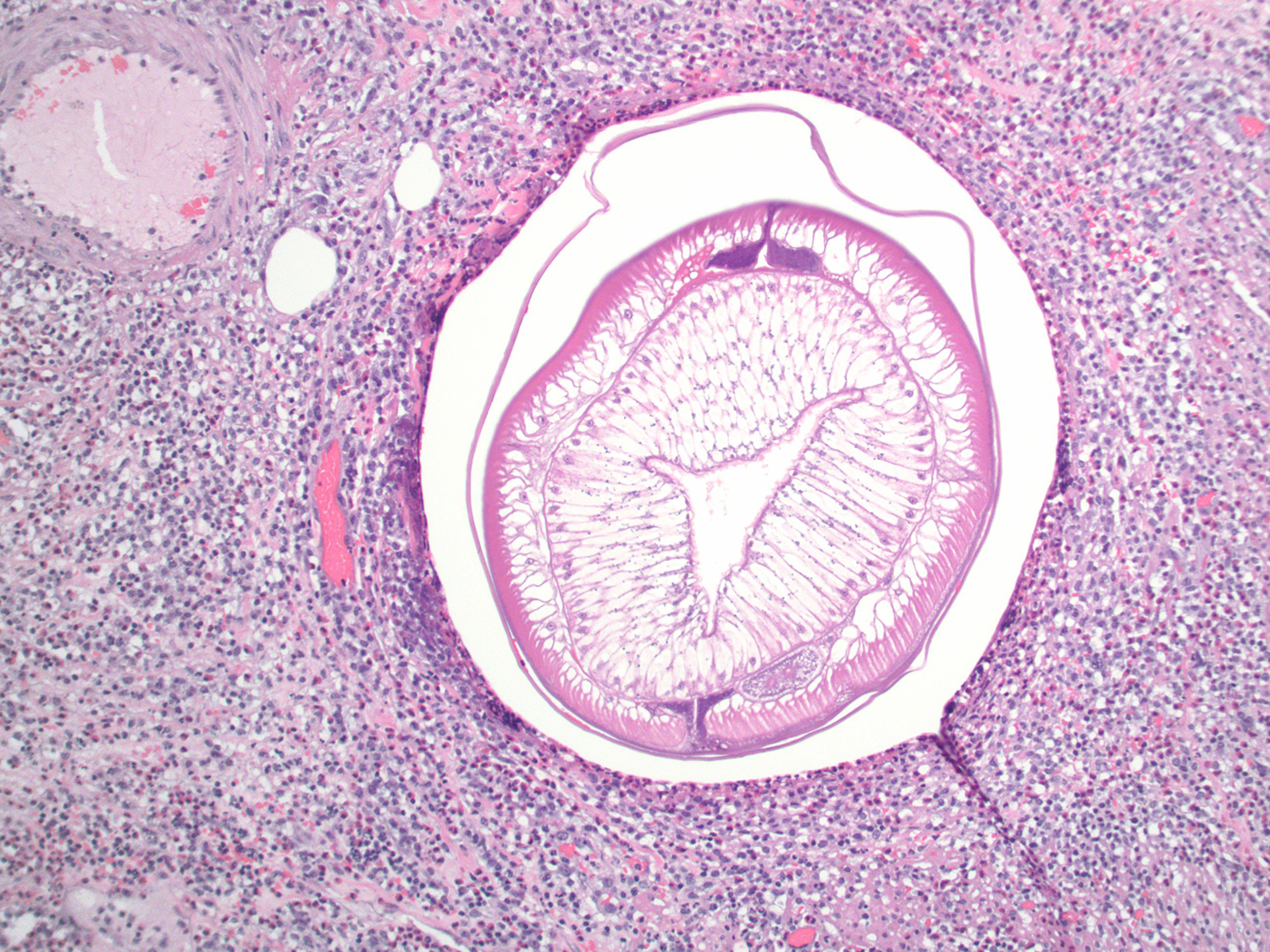 Thanks to all who provided comments on this case! Idzi kicked us off with his comment: "The Y-shaped lateral chords tell me that this is patient has eaten raw (or undercooked) fish! 😉". Florida Fan then elaborated, "The cross sections tell us that this is a nematode. From online publications and Idzi's comment, the very tall musculature and Y-shaped lateral chords favor a diagnosis of anisakiasis."